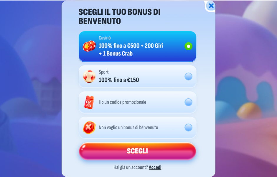 Attenzione, però, a un aspetto importante, ovvero che la prima scelta da prendere riguarda il bonus di benvenuto. C’è quello dedicato ai giochi da casino, quello per le scommesse sportive e, in alternativa, l’area in cui inserire un eventuale codice promo. L’offerta per i giochi da casinò si attiva in automatico subito dopo il deposito (si parte da un minimo di 20€) e prevede credito extra fino a 500€ + 200 giri omaggio per le slot. I requisiti di scommessa sono compresi tra 35x a 40x.